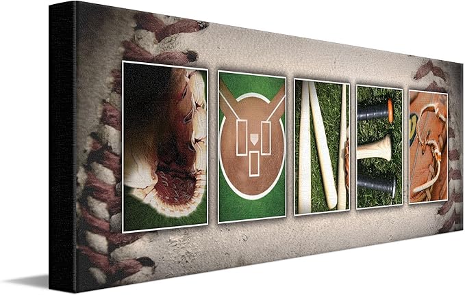 - PERSONALIZED: This stunning print features any name customized using hi-res photos related to baseball. You can even select from many different backgrounds (including a baseball field, baseball, and more). Photos include gloves, baseballs, bats, fields, and other baseball equipment.