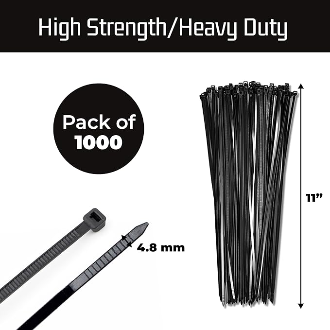 Bolt Dropper 11" Black Cable Ties, 1000 Pack, 50 lbs Tensile Strength - Heavy Duty Zip Ties, Self-Locking Premium Nylon Tie Wraps for Indoor and Outdoor Cable Management (Black)
