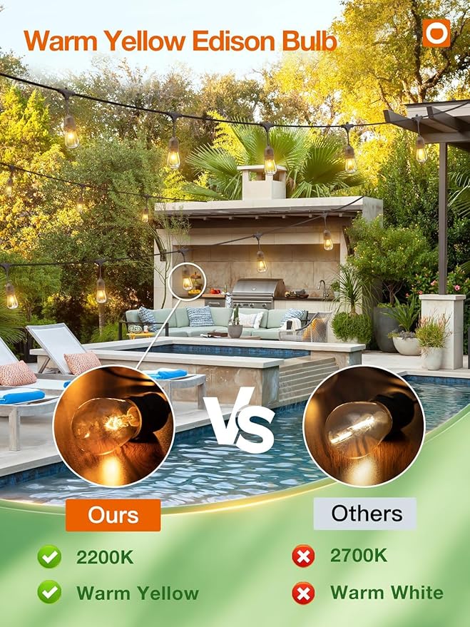 - [Dimmer Compatible to Set The Right Mood] For greater mood lighting flexibility and a more soft glow, a dimmer switch(not included) to create the ideal atmosphere for a birthday party, family reunion, or wedding reception. It adds flair to bistro deck porch patio garden backyard terrace pergola café restaurant malls for wedding BBQ party banquets, also suitable for tree-lighting