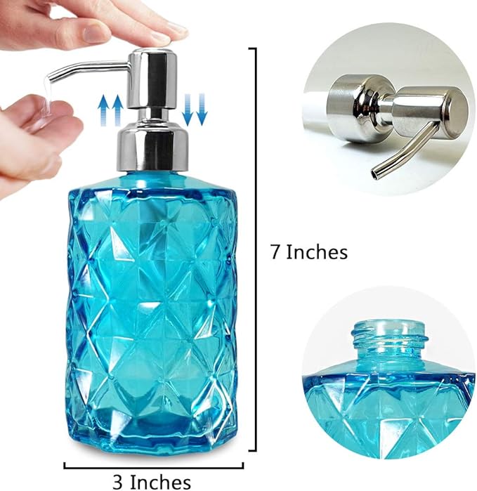 JASAI Diamond Design Soap Dispenser with 304 Rust Proof Stainless Steel Soap Pump, 12 Ounce Kitchen Soap Dispenser for Bathroom, Hand Soap, Dish Soap (Clear Blue).