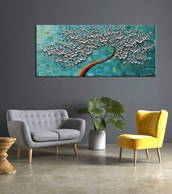 YaSheng Art - 24x60inch Large Wall Art Flowers Oil Painting On Canvas Texture Palette Knife 3D Silver Flowers Tree Paintings Abstract Artwork Canvas Wall Art Home Living Room Decor Painting