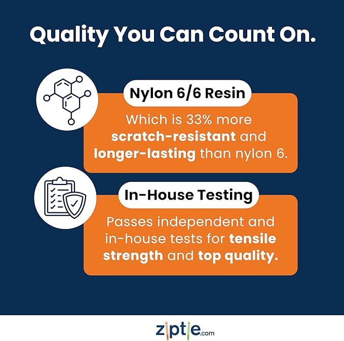 - DURABLE MATERIAL: Our wire ties are privately tested and UL listed to ensure top-tier quality. Designed for long-lasting performance and resistance to wear in tough environments. Made from high quality industrial-strength Nylon 6/6 - crafted with a 50-lb tensile strength.