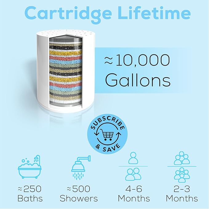 - REPLACEABLE CARTRIDGES: Each shower head filter replacement guarantees 2-3 months (or 10,000 gallons) of superior water filtration. Simply twist the capsule, swap to a new cartridge, and enjoy uninterrupted, refreshing showers