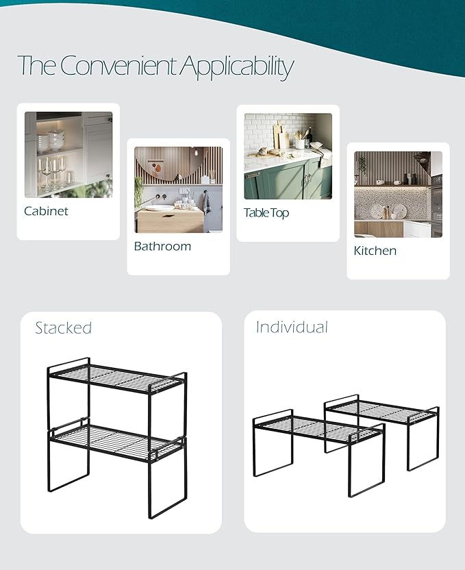 - EXTRA SPACE: These stackable cabinet shelves maximize storage efficiency, providing more spaces as a riser which allows you to use the upper space. The added storage space helps organization and tidiness. All the wee little bottles, tins, vials, pans and a myriad of other kitchen utensils could go underneath, the middle or the top of the cabinet shelf, reaching with ease.
