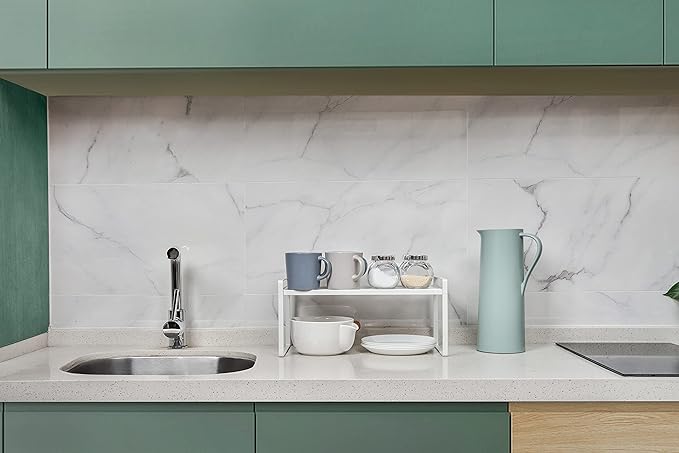 - EXTRA SPACE: These stackable cabinet shelves maximize storage efficiency, providing more spaces as a riser which allows you to use the upper space. The added storage space helps organization and tidiness. All the wee little bottles, tins, vials, pans and a myriad of other kitchen utensils could go underneath, the middle or the top of the cabinet shelf, reaching with ease.