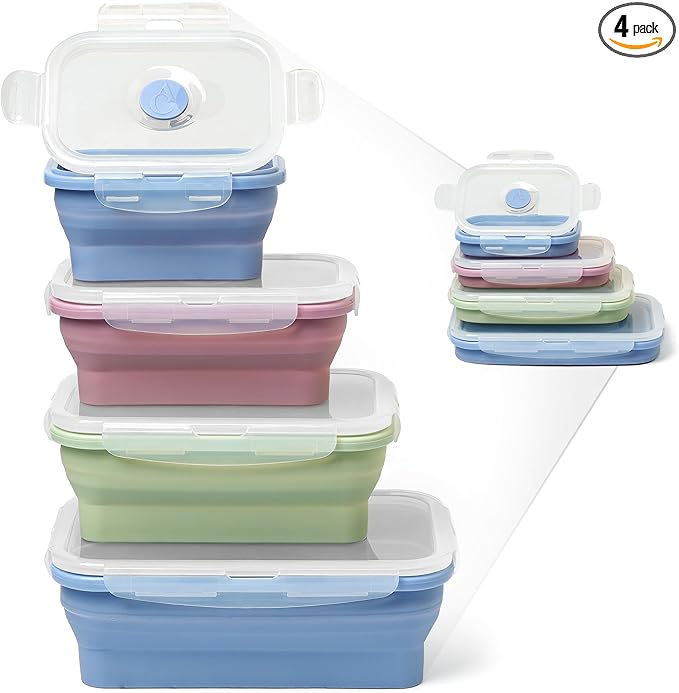ICHC Set of 4 Collapsible Food Storage Containers - Space-Saving Silicone Meal Prep Boxes, Airtight and Stackable Lunch Containers, Microwave and Freezer Safe