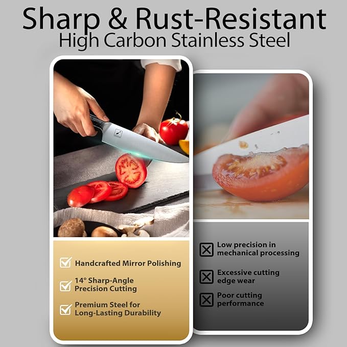 - High-quality Kitchen Knife Set: Each knife blade in this chef knife block set is made of premium imported steel from Japan, safe for dishwasher. All the knives are precisely processed heat treatment ensuring every blade maintains its strength and function. Rockwell hardness reaches 56 ± 2 HRC