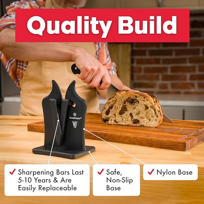 - QUALITY BUILD – Choose between the VG2 Professional (stainless steel base) and the VG2 Classic (nylon base). Both models use the same ultra-hard tungsten carbide sharpening surface. The sharpening bars last 5-10 years and are easily replaceable. Both models have a non-slip base for safe sharpening.
