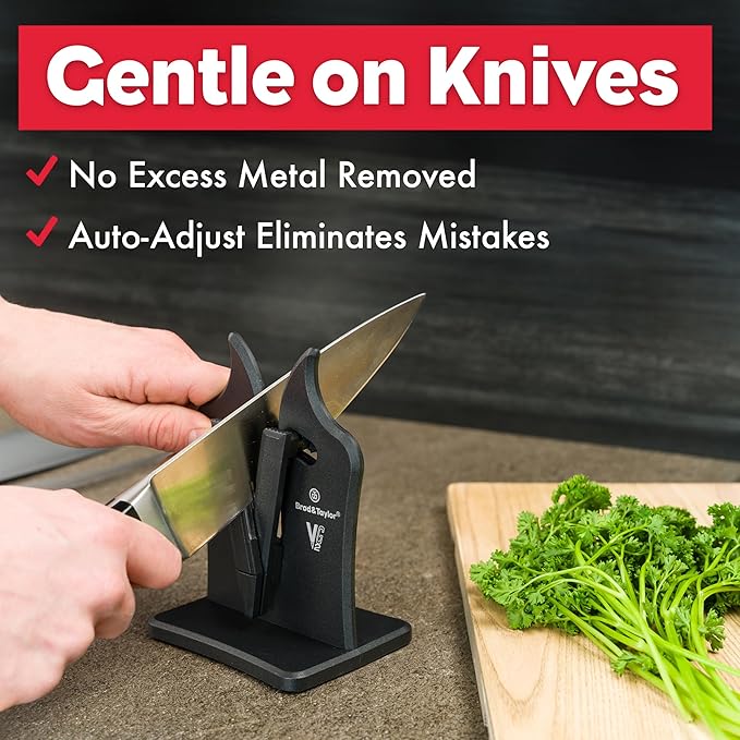 - GENTLE ON KNIVES – The VG2 preserves the life of your blades by sharpening without removing excess metal. Its spring-loaded edges eliminate mistakes and improper sharpening. Unlike electric sharpeners which overheat blades, the VG2 is hand-operated and uses carbide edges that cut quickly without power.