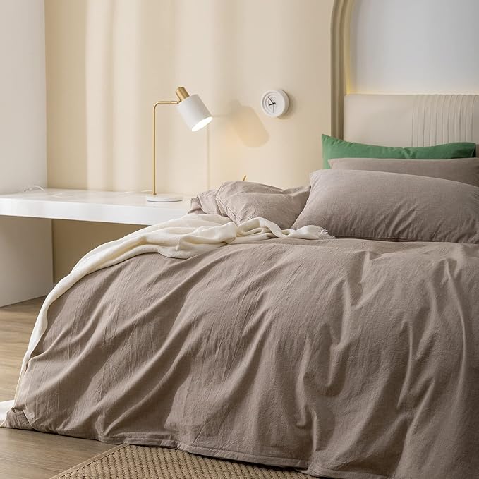 JIYUAN 100% Washed Cotton Duvet Cover Set Comfy Simple Style Soft Breathable Textured Durable Linen Feel Bedding for All Seasons King, Taupey