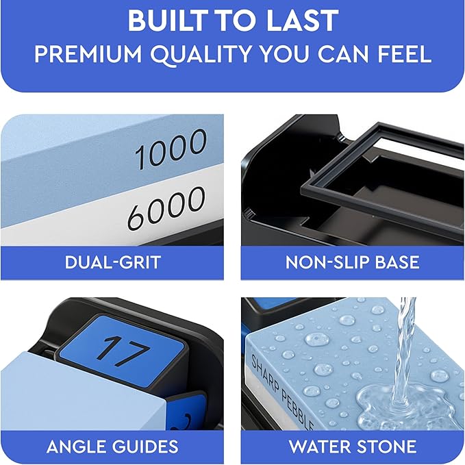 - Built-In Sharpening Guides: This wet stone set includes premium quality grit 1000/6000 water stones; Built-In switchable angle guide with 4 angles 15/17/20/22 Degrees to accommodate a wide range of knives; non-slip innovative sharpening base for holding the stone for sharpening securely and easily