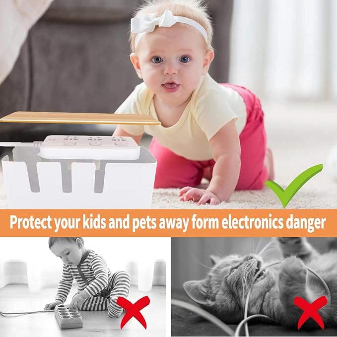 - 【REDUCE The RISKS of ACCIDENTS,ENSURE SAFETY】With the help of a cord box organizer, you can prevent your kids or pets from putting their hands-on hazardous wires or cables. Also avoids tripping accidents caused by exposed cables.Any issues of our products within 90 days, REPLACEMENT or REFUND will be provided