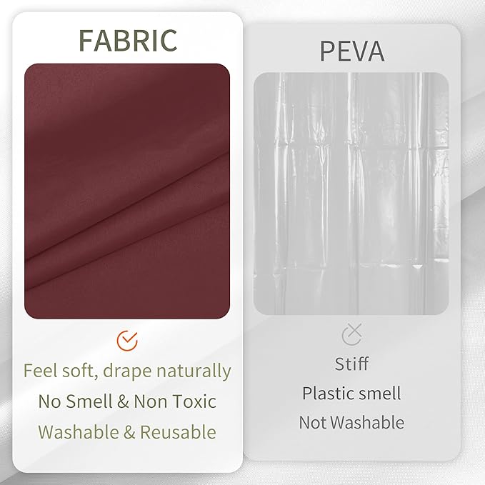 - QUALITY CONSTRUCTION: This cloth shower curtain with hotel quality is odorless and PVC free & BPA-Free, NO plastic smell like PEVA/EVA. The tightly woven fabric prevents curtain from soaking and keep your floors free from splashes and sprays of water