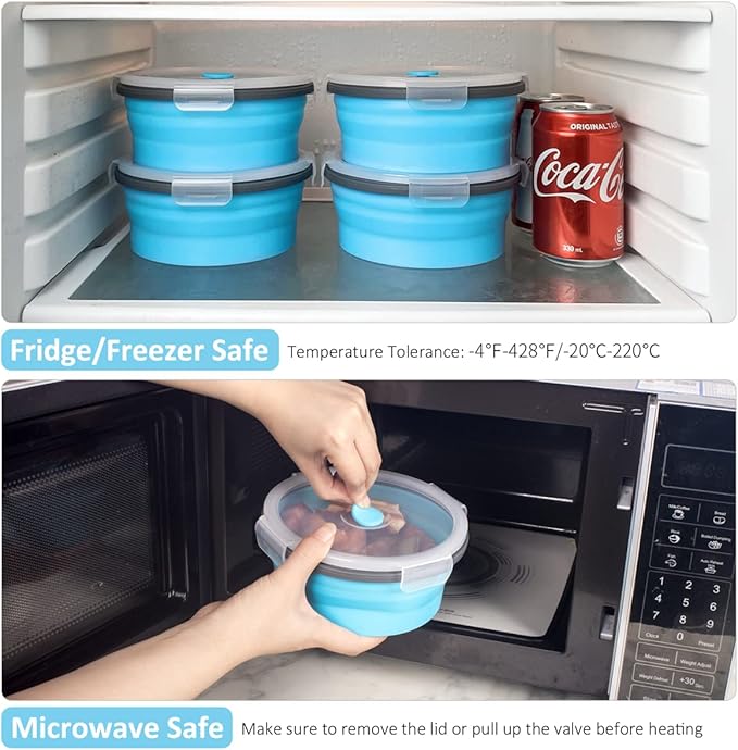 - 【MICROWAVE, FREEZER AND DISHWASHER SAFE】Temperature tolerance of the kitchen circular collapsible storage containers for food is -4°F~428°F/-20°C~220°C. Microwave safe and freezer safe. Warm Reminder: Must pull up the air vent valve on the lid or remove the lid before heating. Dishwasher Safe. Just pop them in the dishwasher top layer when you are done for hassle-free cleaning.