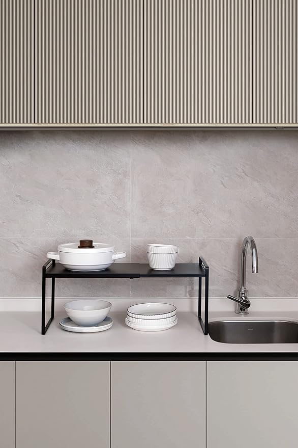 Nxconsu Expandable Cabinet Shelf Organizer Riser for Kitchen Pantry Cupboard Under Sink Countertop Home Storage Organization Rack Space Saver Freestanding Heavy Duty Nonslip Stackable Black