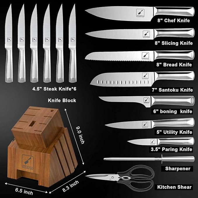 - Easy Care and Storage:Imarku 16 PCS professional knife set includes: 8" chef knife, 8" bread knife, 8" slicing knife, 7" santoku knife, 6" boning knife, 5" utility knife, 3.5" paring knife, 6pcs 4.5" serrated steak Knife set, multi-purpose shears, knife sharpener and block. Kitchen Knife Sets keep knives organized, neat, and space-saving. Tip: Dishwasher safe, but hand washing is better for longer sharpness and service life