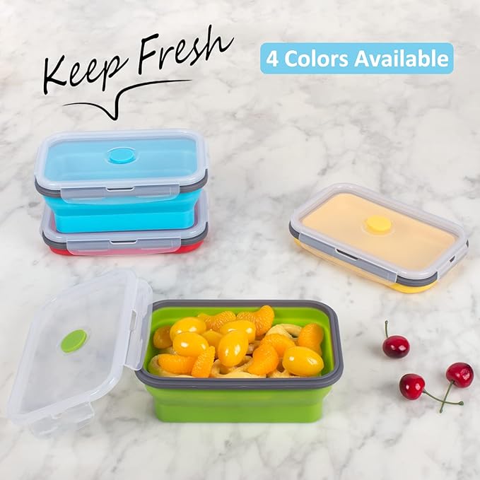- 【ENLARGED SIZE】In regard to some customers' complaint of the small size of 11.8 fl.oz/350ml, we now launch a enlarged size: 27 fl.oz /800ml. This collapsible food storage containers with lids are great for adult or family. Set of 4 pack. They comes in 4 different colors: yellow, green, blue, red. You can use the different color for specified food.