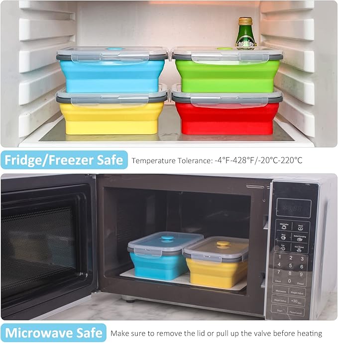 - 【MICROWAVE & FREEZER & DISHWASHER SAFE】Temperature tolerance of the kitchen collapsible storage containers for food is -4°F~428°F/-20°C~220°C. Microwave safe and freezer safe. Warm Reminder: the air vent valve must be pulled up or remove the lid before heating. Dishwasher Safe. Just pop them in the dishwasher top layer when you are done for hassle-free cleaning.