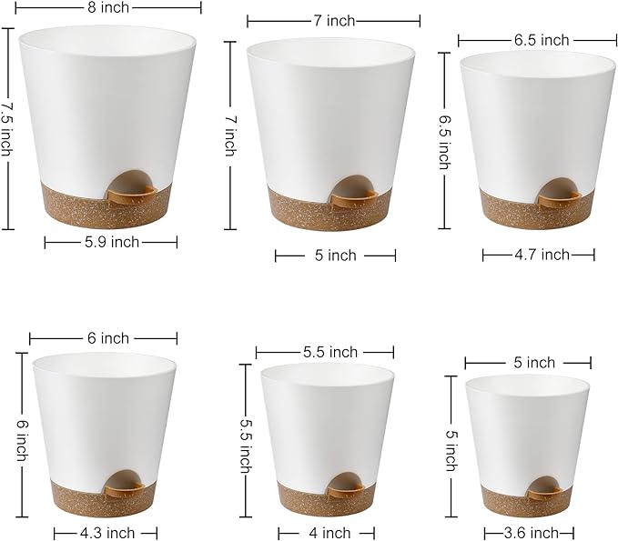 Indoor Self Watering Planters with Drainage Holes and Saucers, 8, 7, 6.5, 6, 5.5, 5 Inches, White, 6 Pots