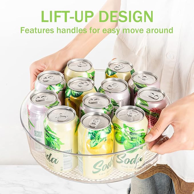 - LIFT-UP HANDLES & DEEP RIM - This lazy susan spinner is built-in features handles for easy gripping and moving around. The extra raised edge prevent items from tipping over while spinning. Sturdy, durable, and great clear quality plastic design matches your modern home style.