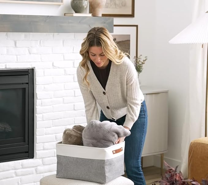 - Decorative Fabric and Vegan Leather – These versatile storage baskets for organizing your everyday life are made with a thick, high-quality fabric and fitted with leather handles to add a stylish touch to a living room, bedroom, office, or personal space.