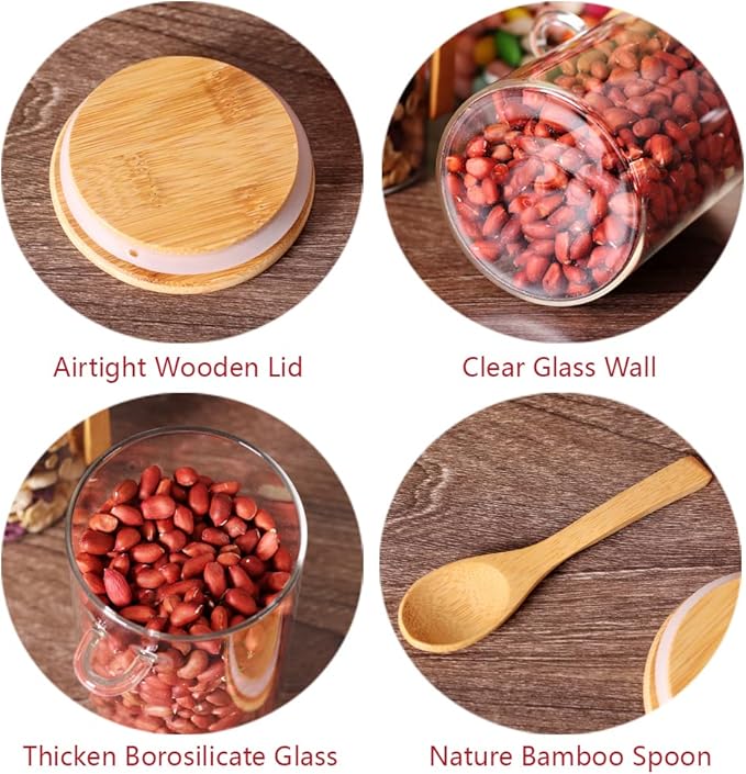 - [Airtight Ribbed Glass Jars with Lids and Spoons] These airtight glass jars come with bamboo lids and silicone sealing rings that can prevent water, dust, and other pollutants from entering the container, thereby keeping your food fresh for a longer time. They are ideal for storing dry and wet foods, baked goods, cookies, oatmeal, tea, spices, and other ingredients.