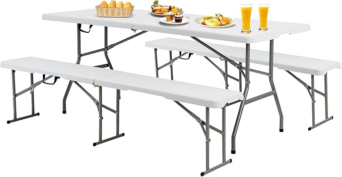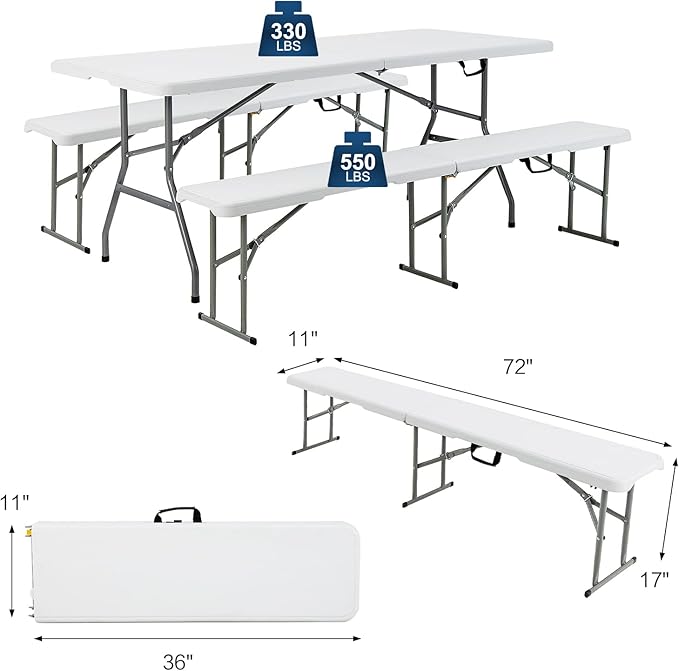 - ✅【Portable & Easy Fold Up】 No assembly required. This 6 foot folding table and benches fold in the center, lock closed, and are compact and easy to store. Comes with a comfortable carry handle for better portability. You can carry this table anywhere with ease.