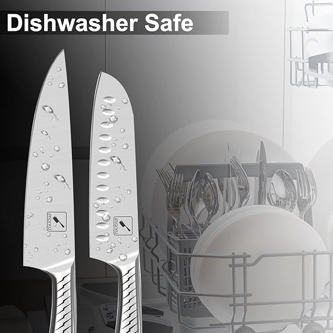 - 【Superior Japanese Steel Kitchen Knives Set】Professional and high-end quality cutlery is forged with AICHI steel which offers an excellent balance of sharp edge retention and durability, a high-quality steel blade will make kitchen prep faster and easier. Rockwell hardness: 56±2 HRC, Safe for dishwasher.
