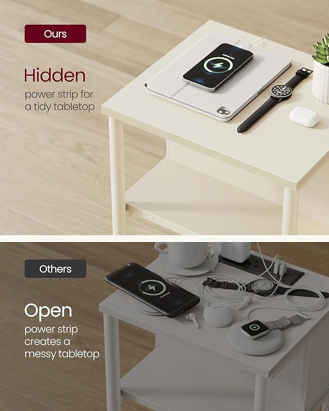 VASAGLE Side Table with Charging Station, 3-Tier End Table with USB Ports and Outlets, Nightstand for Living Room, Bedroom, 11.8 x 13.4 x 22.8 Inches, Plug-in Series, Cream White