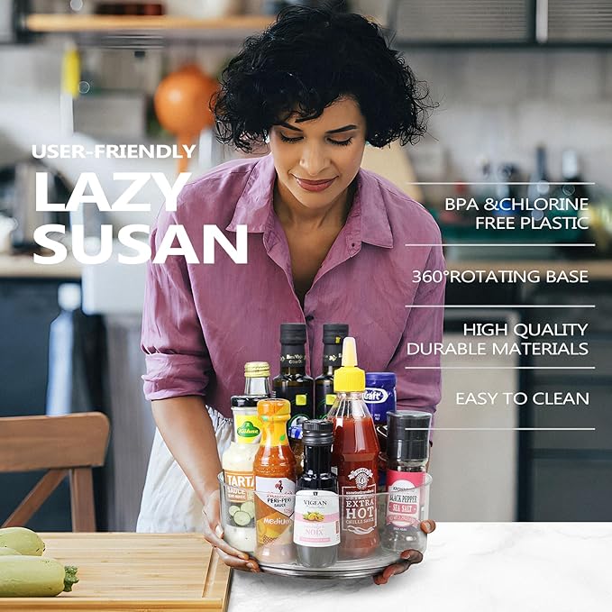 - Widely Used, Keep Your Space Clean & Tidy:Multifunctional refrigerator lazy susan for home storage. Ideal for organizing kitchen items like jars, spices, condiments, and paper towels. Save space on countertops, cabinets, and more with this fridge lazy susan solution. This clear lazy susan organizer can Keep your home clean and tidy