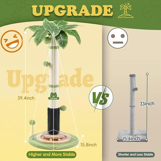 - [4-in-1 Cat Scratching Post] This upgraded cat scratching post has even more features, a sisal-covered cat scratching post, a grommer brush that can be used for massaging and grooming cat fur, a solid wood base, an interactive toy ball, 4 hanging toy balls and 1 spring ball to inspire cats to catch prey like a predator, increasing their playtime and bringing them more fun.