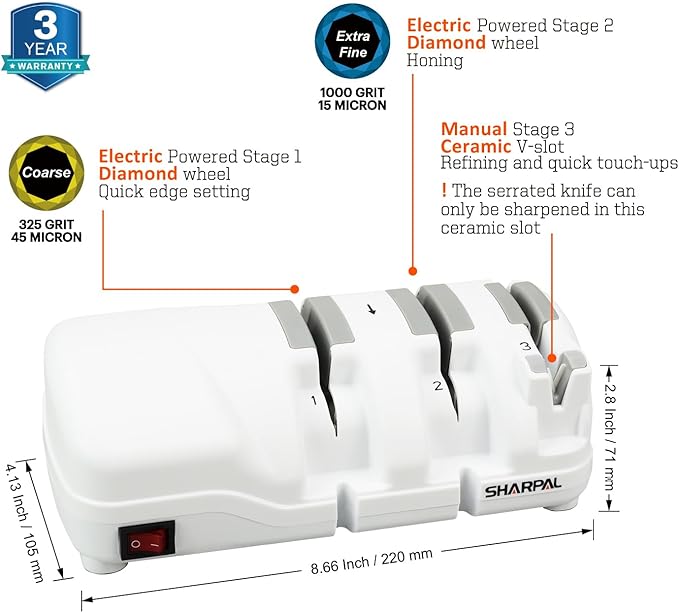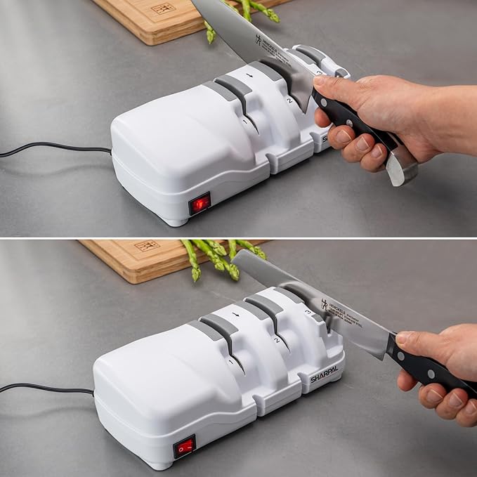 - Three Functional Slots: This SHARPAL Electric Knife Sharpener is designed with 3 stages to ensure a razor-sharp edge on most double-beveled straight edge and serrated knives. Simultaneous grinding of both blades saves much time and ensures that both blades are sharpened the same number of times. It provides a professional sharpening experience right in your kitchen.