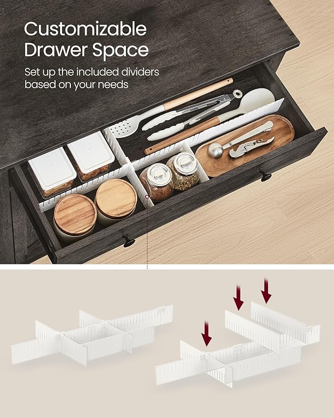 - Customizable Design: This buffet cabinet comes with an adaptable drawer divider to let you organize the drawer space as you need. The bottom cabinet features an adjustable shelf with 5 height options, allowing you to store items of different sizes