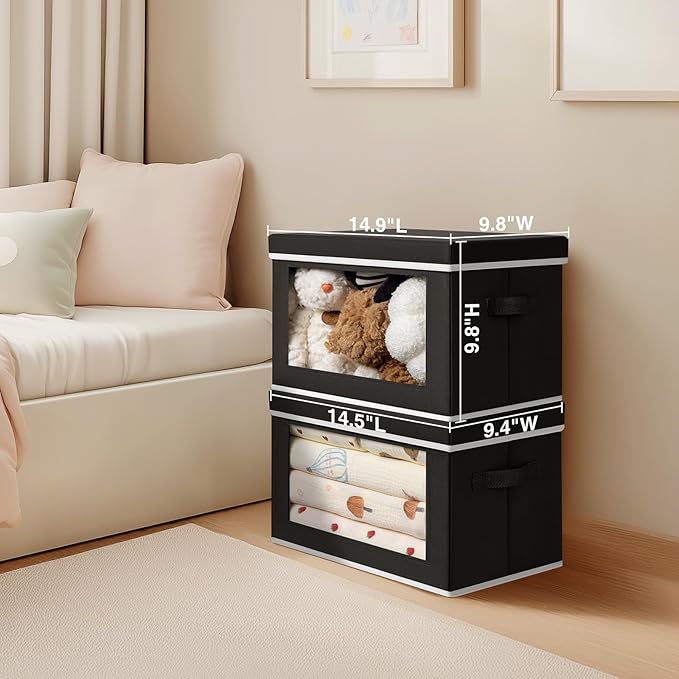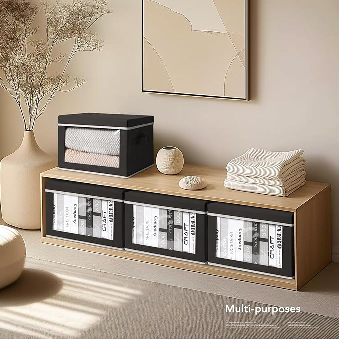 Foldable Storage Box with Lid - Closet Storage Organizer with Window, Storage Bins with Lids for Clothes, Fabric Storage Baskets for Shelves, Bedroom, Dorm, Black, 4 Pack