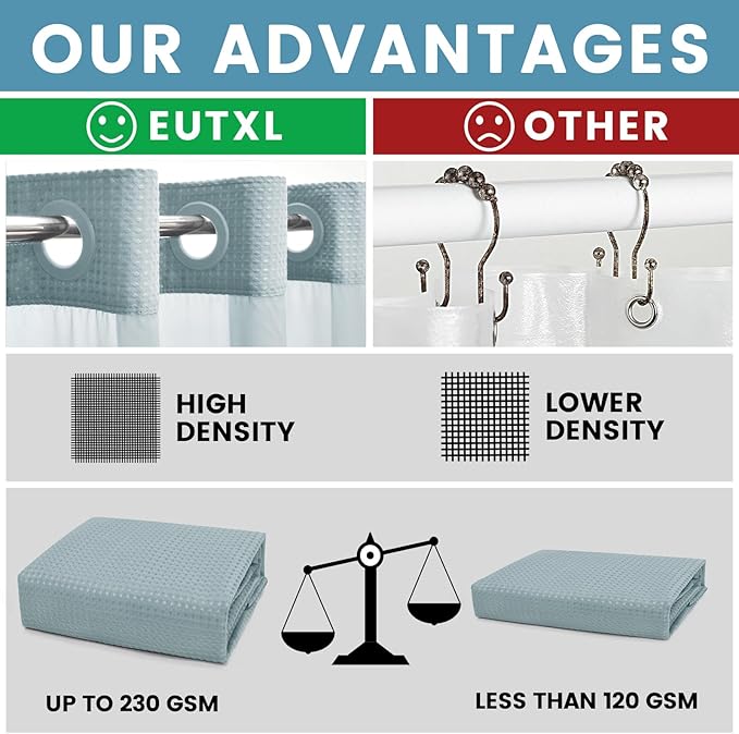 - 【Thick "Cotton" Type Fabric Shower Curtain】Made from expertly chosen and tested Heavyweight Polyester Fabric, touches like a cotton feel. 230GSM (Gram Per Square Meter), about 0.8 pounds heavier than normal 90GSM fabric shower curtains; Honeycomb waffle weave pattern adds elegance to your bathroom
