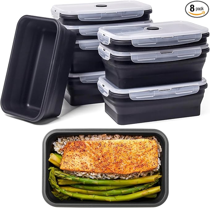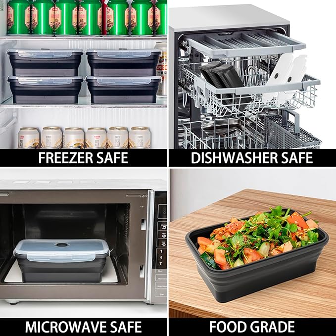 - 【COLLAPSIBLE & STACKABLE - SPACE SAVING】These collapsible meal prep containers with lids can be folded flat when not in use to save your storage space up to 50%. Their stackable design maximizes vertical space in your fridge, keeping it organized and efficient. Perfect for home, travel, meal prep and RV organization. Lightweight, durable, and practical—ideal for any lifestyle