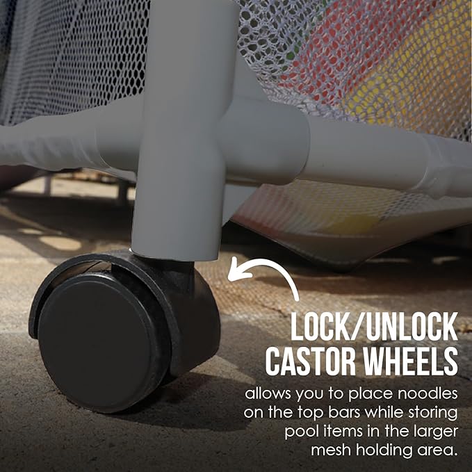 - Side pockets provided for additional storage of small items. Store toys, inflatables, floats, noodles, balls, goggles, pool cleaning tools, and more.