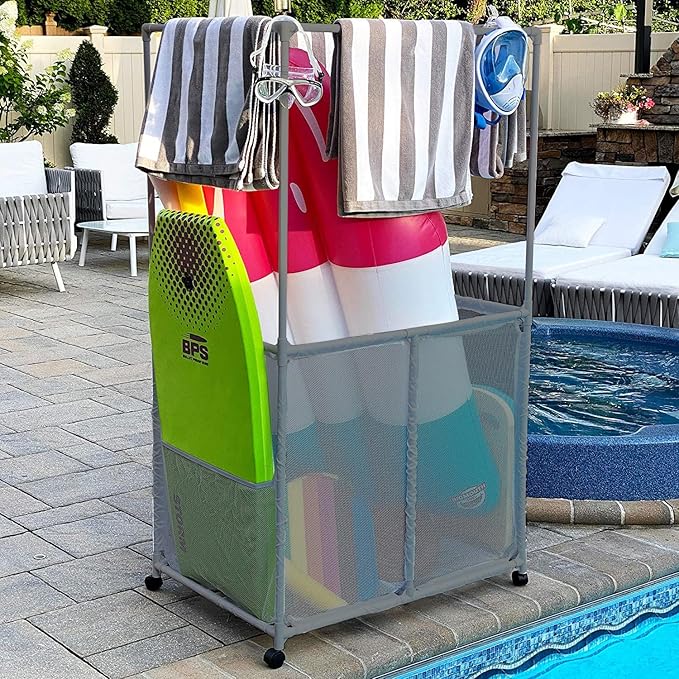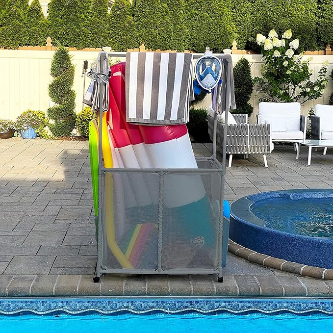 - Raised Towel Hanger area allows you to place towels on the top bars while storing additional pool items in the mesh holding area.