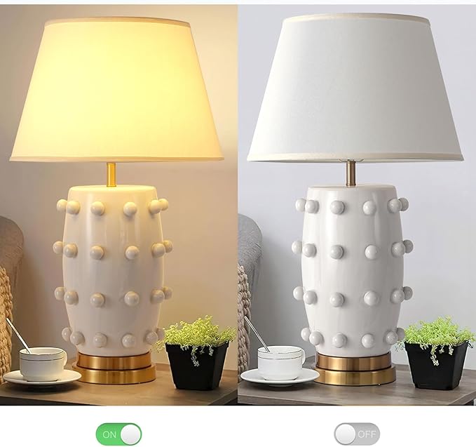 - The distinctive stacked ceramic balls create a visually appealing texture that stands out. The texture and geometric pattern of the unique white ceramic base has a medieval atmosphere and "designer lamp" style, which can be integrated into almost any modern or transitional interior decoration.