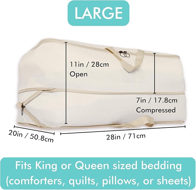 - XXL CAPACITY: The comforter storage bag has an extra large capacity and is easy to use. It can easily fit queen and king sized items! Compresses items from 11 inches down to just 7 inches, saving up to 60% of storage space.