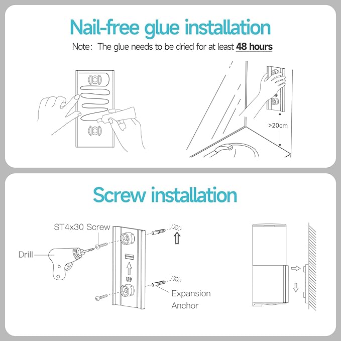 - Flexible Installation: Includes screws and nail-free glue for mounting. Nail-free glue can only be used on clean, dry, and flat walls, and needs 48+ hours for fixation