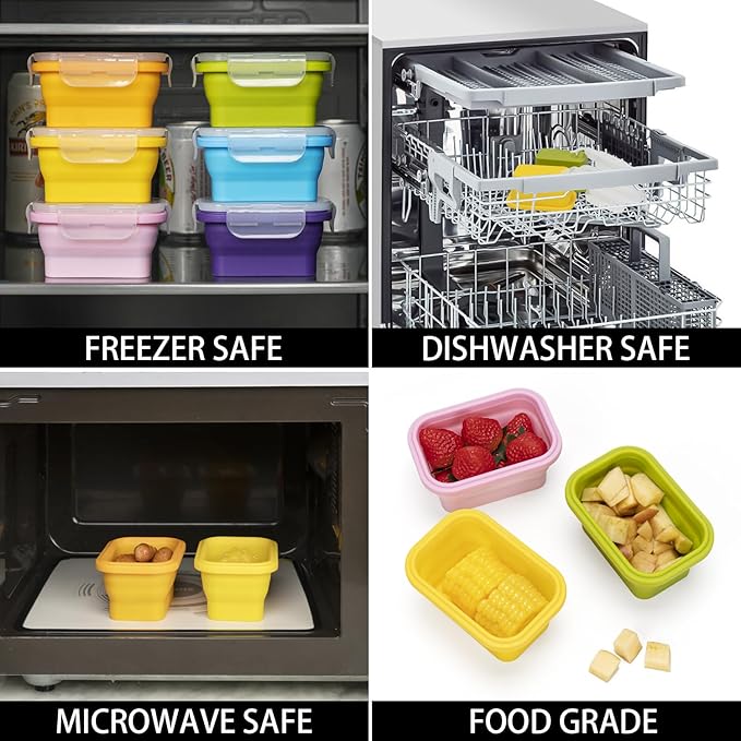 - 【MICROWAVE, FREEZER AND DISHWASHER SAFE】Temperature tolerance of the collapsible snack containers with lids is -4°F~428°F/-20°C~220°C. Microwave safe and freezer safe. Dishwasher Safe. Just pop them in the dishwasher top layer when you are done for hassle-free cleaning