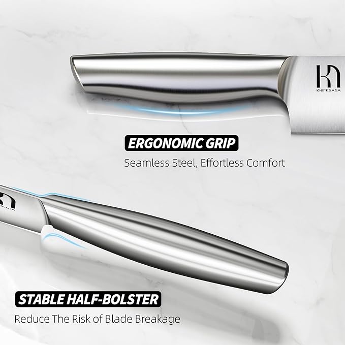 - 【Ergonomic Comfort & Perfect Weight】Prioritizing your comfort and safety, KnifeSaga's kitchen knife is expertly designed with ergonomics, featuring a silver handle that conforms perfectly to your grip. The combination of the perfect weight & ergonomic grip ensures fatigue-free cutting for extended periods.