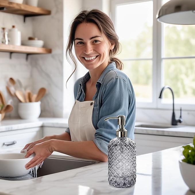 - Equally Elegant and Functional Glass Soap Dispenser With Featuring Gem Patterned and Gray in Coler. Lovely Way to Adds a Classy Style Sink Side in Your Bathroom or Kitchen.