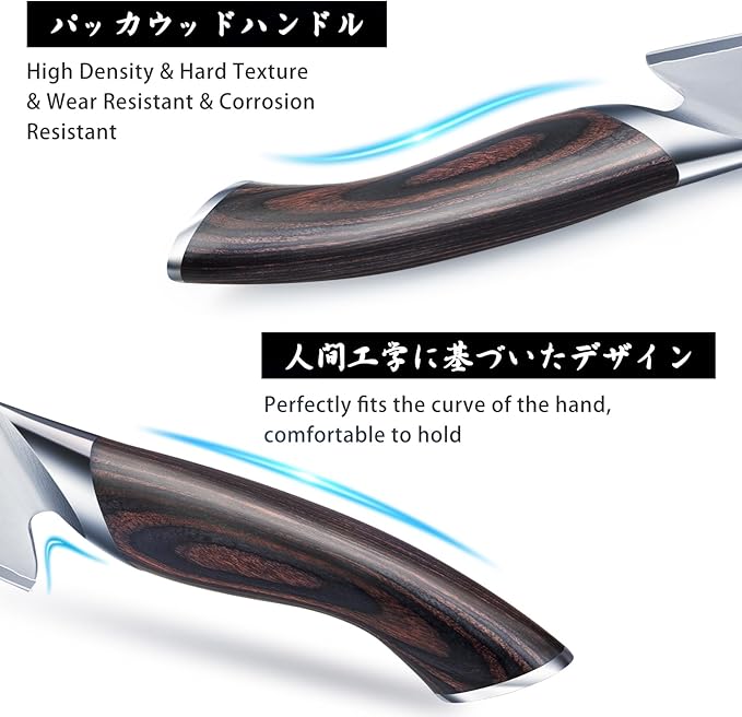 - 【Ergonomic Pakkawood Handle】The ergonomic handle of the knife set is designed to fit perfectly into any hand shape and significantly reduces the fatigue and discomfort that may occur when using the knife for a long time; The weight and balance point of the handle are carefully calculated, making the knife more flexible when in use