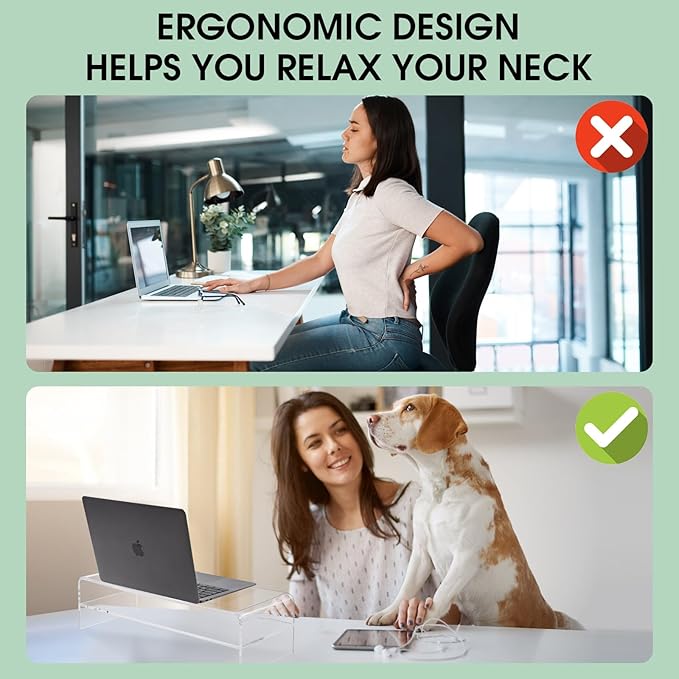 - [Ergonomic Design] This 20in large acrylic monitor stand use it to raise the monitor 5.5" to fully relieve your neck, back and shoulder fatigue, improve your posture and maintain your health.
