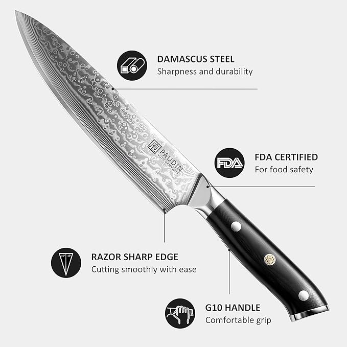 - 67-LAYER DAMASCUS STEEL: PAUDIN chef knife is expertly forged from 67 layers steel plates with a VG10 Japanese steel cutting core. This kitchen knife offers excellent edge retention and sharpness, rust resistance and durability, with a high hardness of 62 HRC.