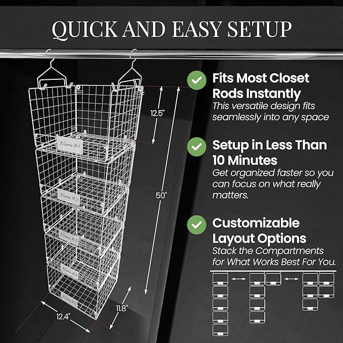 - PERSONALIZED STORAGE SOLUTIONS – With 4 hanging hooks, 8 S hooks, & 5 custom nameplates, our closet hanging organizer offers complete customization for clothes, shoes, & accessories. Tailor your setup to fit your space & needs, whether in closets, kitchens, or bathrooms