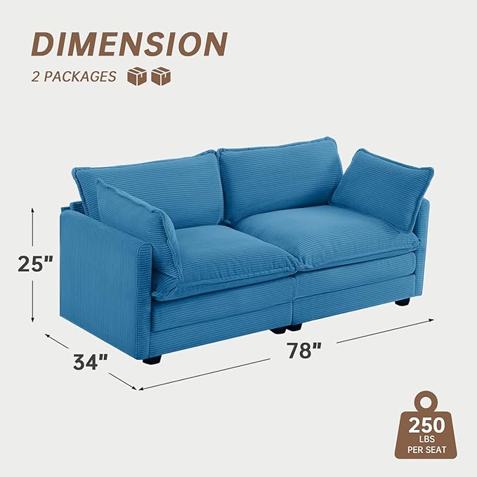 ROWHY 78'' Sectional 2 Seat Cloud Loveseat with 2 Throw Pillows, Modern Corduroy Love Seat, Convertible Cozy Sofa for Living Room, Bedroom and Office, Blue