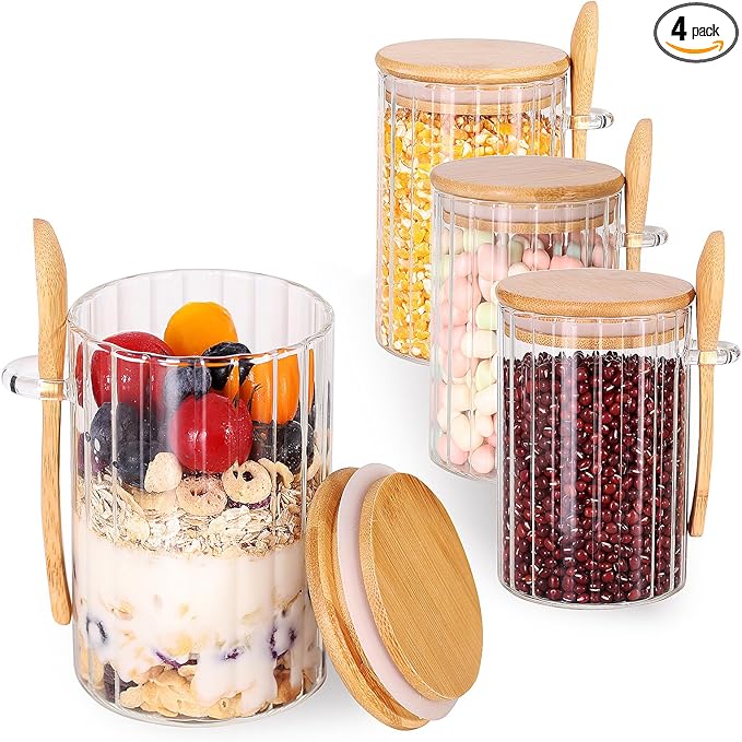 4 Pack Glass Containers with Lids and Spoons, Overnight Oat Container with Lids Glass, Oatmeal Jar with Spoons, Meal Prep Jars for Yogurt, Chia Pudding (Ribbed Round 4PCS)